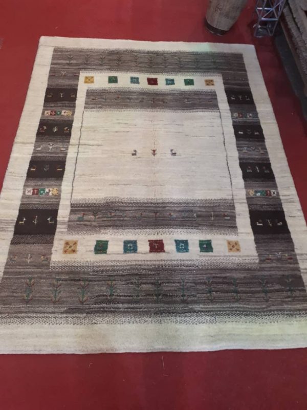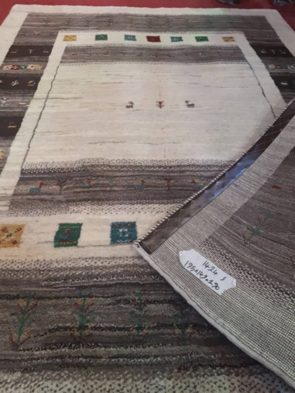Gabbeh 1424 is a bright brown or braun Gabbeh teppich from EPERSIANRUG company with size 6.4 feet by 4.9 feet. or 195 cm by 149 cm. The area of this rug is 2.9 sqm. The material is wool and this Gabbeh rug is hand woven. Sku number is 1424.