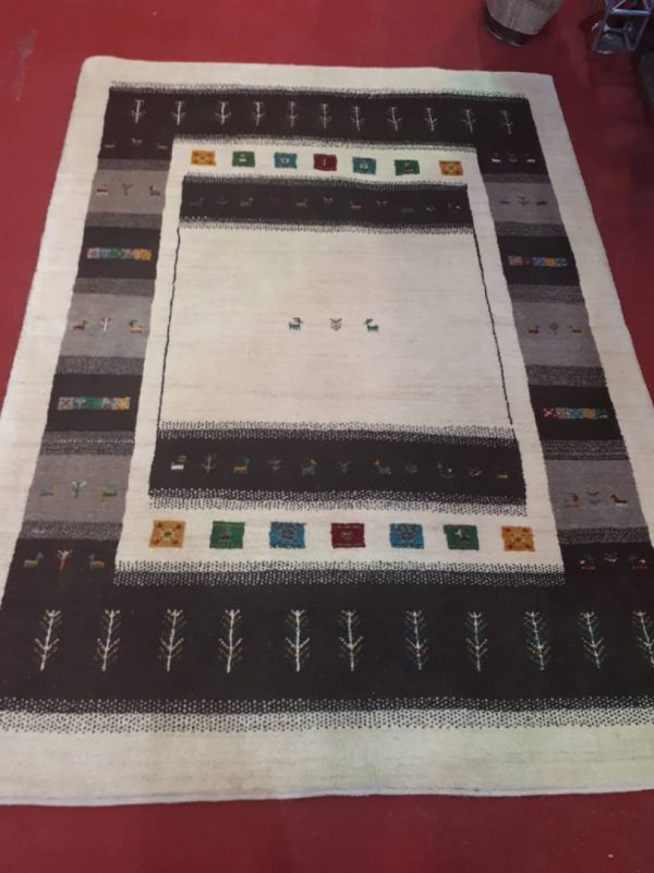 Gabbeh 1425 is a gorgeous thick knot carpet with white and brown color. This Gabbeh teppich is in EPERSIANRUG stock with size 6.4 feet by 4.8 feet. or 196 cm by 145 cm. The material is pure sheep wool and this Persian Gabbeh is hand knotted. Sku number is 1425.